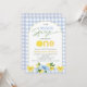 Lemon themed first birthday invitation for a baby girl featuring a blue flowers and lemons arrangement, yellow bows, arch and a blue gingham or plaid pattern background. This main squeeze 1st birthday invitation also features a decorative word that spells one.