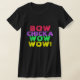 Black fitted V-neck, saying "bow chicka wow wow!" Bow is pink, chicka is purple, wow is green, wow! is yellow