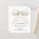 White background, decorated with a large ivory colored bow with pearls and a golden cross. Personalize and add a name and details details.