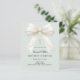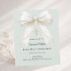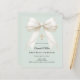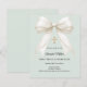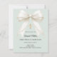 A soft pale sage green background, decorated with a large bow with pearls and a golden cross. Personalise and add a name and details details.