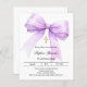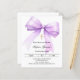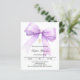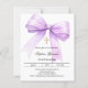 A white background, decorated with a lavender coloured large bow and a golden cross. Personalise and add a name and details details.