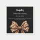 A black background. Decorated with a large bow with leopard print. Personalise and add a name, age, date and a text. White handwritten style script.