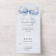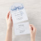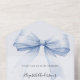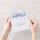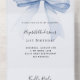 A light blue background, decorated with a large bow. Personalise and add names, party details, RSVP date, return address and name.