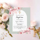A white arch frame and sage green background. Decorated with pink flowers and pink bows. A golden cross. Personalise and add a name and details.