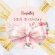 A blush pink coloured background. Decorated with a large bow and pink florals, roses. Personalise and add a name. Black handwritten style script.