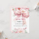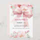 An elegant white background, decorated with a large pink bow and pink flowers. Personalise and add a name and party details.