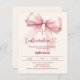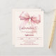 A soft cream colored background, decorated with a pink large bow and a golden cross. Personalize and add a name and details details.