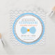 A custom baby boy invites featuring large bow tie design and diagonal stripes in blue and orange colours combination with charcoal