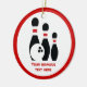 Bowling ball and pins black red custom round ormanent displaying a minimalist icon of three black bowling pins with red stripes, a ball and your text on white background with red border. This cool design is a template and it is completely customizable. Personalize it and change text with monogram, name or your message.