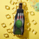 A bowling bottle cooler featuring photos of bowling pins being knocked down by a green bowling ball.