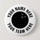 Bowling buttons with custom team names, Make your own round badge with name and team name. Great for party, sports event, club, tournament and more. Black bowling ball with personalised text.