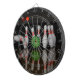 A dartboard featuring a photo of a bowling ball and bowling pins.