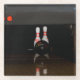 A glass drink coaster featuring an image of two bowling pins about to be knocked down for a spare.