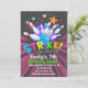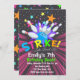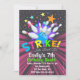 Bowling Birthday Invitations with a bowling ball striking the pins with bright glowing colours and stars on a dark background that's says Strike Lets Bowl For.