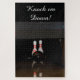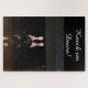 A jigsaw puzzle featuring a photo of two bowling pins about to be knocked down by a bowling ball and the words Knock em down!