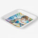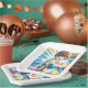 A cute anime boy's bowling themed Birthday paper plates. Colours used are orange, blue and green.