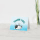 A bowling thank you card, especially works for thanking guests who came to your bowling party. Thank you is written with a curved text. The design is a black and white set of bowling pins and a bowling ball. Set on a blue ombre background.