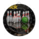 A dartboard featuring a photo of bowling pins.