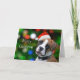 Fawn and white boxer dog wears a too small santa hat somewhat reluctantly but looks cute with bright Christmas lights in the background dog lovers Christmas holiday greeting card