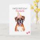 Happy Birthday with a personalised name. A cute Boxer puppy dog illustration with a birthday hat and balloons. Add your own message for a personal unique card. Art made with watercolors.