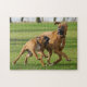 Two frisky German Boxer dogs, a puppy and his older friend running together across a pasture. Both fawn boxers have a lot of fun playing and romping about. A hilarious snapshot photographed by Katho Menden, a gift for doglovers. http://www.zazzle.com/kathom_photo