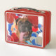This is a standard metal lunchbox that appears to work just fine. We designed this box ourselves with an uploaded photo and custom text on the front and back. It looks absolutely beautiful except the front of the lunchbox is not centered like it shows in the photo. The print borders don't align with the inset flat part of the box where the preview photo online showed it perfectly centered in there. The back looks nice and centered though.