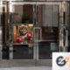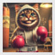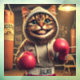 The image shows an anthropomorphic cat in a boxing ring. The cat is wearing a grey hoodie with the hood over its ears and red boxing gloves. The cat's broad, human-looking grin is particularly striking, giving the image a humourous, almost crazy expression. The background shows a classic boxing ring with punching bags, posters and dim lighting, which reinforces the combative, yet funny atmosphere.