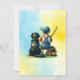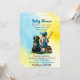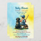 Yellow and Blue personalised boy's baby shower invitations with a baby boy sitting next to a dog, a Black Lab with a baseball theme.