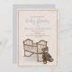 This design features a baby blue boy cute vintage classic invitation, with a rustic classic teddy bear blue, a trendy bear stuffed animal teddy, an elegant calligraphy script typography, QR code for gift registry icon for store websites online git registry a trendy classic traditional invitation, a vintage cradle bassinet crib bunting, a brown tan sage blue beige, an old fashioned simple minimalist style, for a baby boy shower invitation, for a boy or girl baby shower hand-drawn artwork by Laura Lacina.