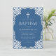 This classic blue baptism invitation with a vintage air, recommended for a boy, has an ornate faux silver foil frame with silvery grey leaves on a classic blue background. Above the text there is a religious cross in faux silver foil. All text can be personalised and has a grey colour similar to the faux silver frame.