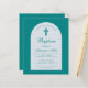 A modern baptism invitation. On a teal blue background, it has a white arch with teal text inside. The word Baptism and the name are written in an elegant calligraphic script; the first line is arched text.
