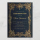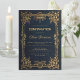 This blue, elegant confirmation invitation with a vintage air, appropriate for a boy, has a vintage golden frame from gold leaves and vines (and a few gold berries) on a navy blue background. There is a gold cross in the upper part of the frame, above the text, with a gold wreath behind it. The name of the child is written in an elegant calligraphic script. All text can be personalised and has a golden colour similar to the gold decorations of the frame.