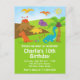 Adorable dinosaurs featuring a blue brachiosaurus, orange tyrannosaurus, yellow stegosaurus, purple triceratops and yellow and orange pterodactyls. In the background is a volcano, sunshine, sky and clouds, palm tree, dinosaur footprints and eggs.