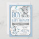 Cute blue and grey / grey elephant and zebra boy baby shower invitation. Great invite for jungle, safari, zoo animals theme baby showers.