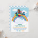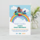 Design features a cute weiner dog smiling, wearing a pilot's helmet, goggles, and a red scarf, flying through blue sky surrounded by white puffy, fun clouds and a colourful rainbow. On the back is a blue and white chequered background. This card sets the tone for a party everyone will love.