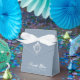 A dusty blue favour box for a boy's first communion. On the flap, it has faux silver foil crest with a cross in it.