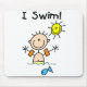 A boy stick figure swims with the fish and the sun smiles down on him on this colourful and cute stick figure boy I Swim bag that's customisable so you can add a name