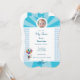 Cheerful baby shower invitation with white and blue colour. Topped with a flying baby carried in balloons. A beautiful keepsake of the most beautiful occasion