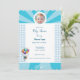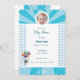 Cheerful baby shower invitation with white and blue colour. Topped with a flying baby carried in balloons. A beautiful keepsake of the most beautiful occasion
