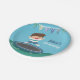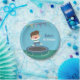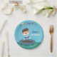 Personalised party supplies of paper plates for a trampoline or playground themed birthday party! It has a cute little boy bouncing gleefully on a trampoline. Bunting flags in various patterns like polka dots, stripes, stars and chevron are hanging in the background. Colour palette of blues and greens makes this great for birthday boys! Add your party message in the template texts provided.