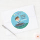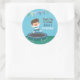 Thank you party favour stickers for a trampoline or playground themed birthday party! It has a cute little boy bouncing gleefully on a trampoline. Bunting flags in various patterns like polka dots, stripes, stars and chevron are hanging in the background. Great for birthday boys! Add your party message in the template texts provided.