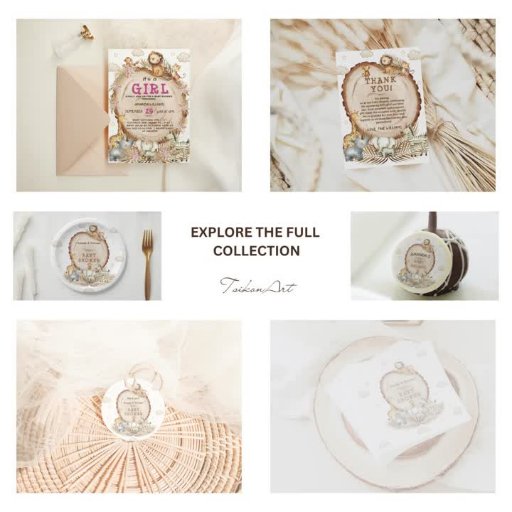 This unique boho baby shower invitation features a mix of vintage rustic accents in warm tones like beige, fawn, and brown. Adorable jungle animals, including a lion, monkey, tiger, zebra, rhino, elephant, and giraffe, add a playful touch. Elegant pampas grasses and palm leaves complement the wood slice background, creating a cosy and inviting atmosphere.