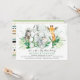 Boy Safari baby shower invitation with jungle animals, elephant, giraffe, and zebra. Back of invite has a colourful striped pattern.