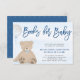 Cute teddy bear boy baby shower books for baby insert card. A sweet brown teddy bear sitting holding a balloon on a light blue watercolor background.
