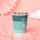 Celebrate a veterinarian themed birthday party with these cute paper cups designed by Destei. The design features a fun cartoon illustration of a young boy veterinarian standing behind a gray examination table with an orange cat and a brown and white puppy, ready to care for his furry patients. He wears a white coat, blue scrubs and a stethoscope around his neck. He has brown hair and a happy expression.