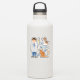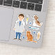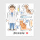 This veterinarian themed sticker set designed by Destei features a cute collection of veterinary illustrations. The set includes a cartoon boy veterinarian who is wearing a white lab coat, blue scrubs and he has a stethoscope around his neck. There is also a brown and white puppy, an orange cat, a syringe with yellow liquid, a blue thermometer, a bandage and three blue paw prints.