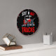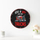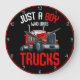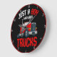 This vibrant wall clock is perfect for any young fan of big rigs. Set against a black background with a bold red rim, it showcases a detailed illustration of a red semi-truck. The text "JUST A BOY WHO LOVES TRUCKS" is prominently displayed in a combination of white and red lettering, making it an ideal and eye-catching piece for a child's bedroom or playroom.