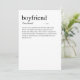 Add some humour and style to your Valentine's Day gift with this funny "Boyfriend Definition" card. Featuring witty, minimalist typography and a clean look, it delivers a fun, lighthearted message that’s sure to make your significant other smile. There’s also a blank space where you can include your personalised handwritten message for him. Want a custom, witty characteristic added to the definition? Reach out to me at: shahirah.creates92@gmail.com, and I’ll make it uniquely yours.