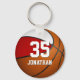 This boys' basketball keychain features a simple basketball graphic with his red and white school colours on two of the basketball's panels and easily customisable player name and large jersey number in a sporty, varsity letter style font - by katz_d_zynes