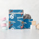 Birthday boys wrapping paper in blue, red, black, grey and white musical rockstar guitarist design. Personalise this boys star birthday paper with your name and age. Currently reads Happy Birthday Oliver 6 today. Uniquely illustrated and designed by Sarah Trett.